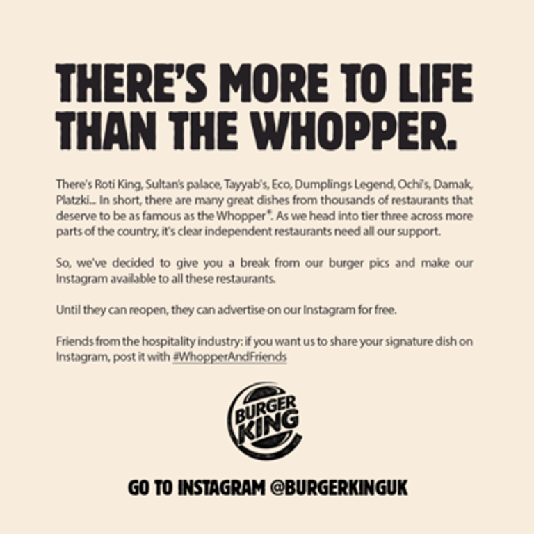 A great example is Burger King. Last month they made their social media page available for any local business to use as an advertising platform. It was a small price to pay for the fast-food giant, but they received hugely positive press coverage, whilst at the same time they tapped into our desire to see support and caring during the crisis.