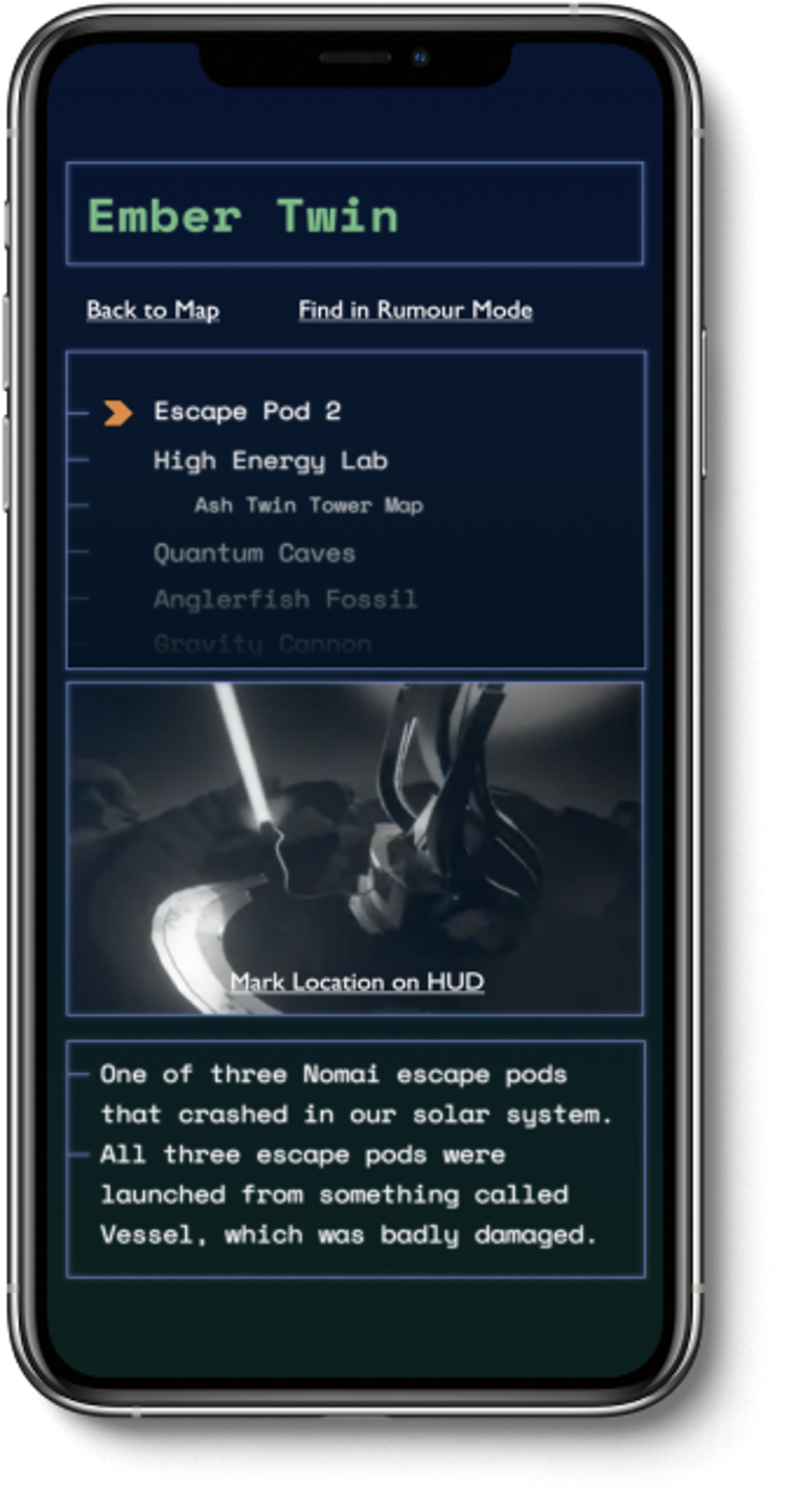 The Ship Log information is then entirely at your disposal, and easily navigable on a mobile device. Even while you’re actively playing, the RSLT becomes a second screen experience, allowing you to quickly review clues on your phone (and even see new ones you’ve just unlocked) while you’re playing, without having to go back to your ship and waste precious looped time.