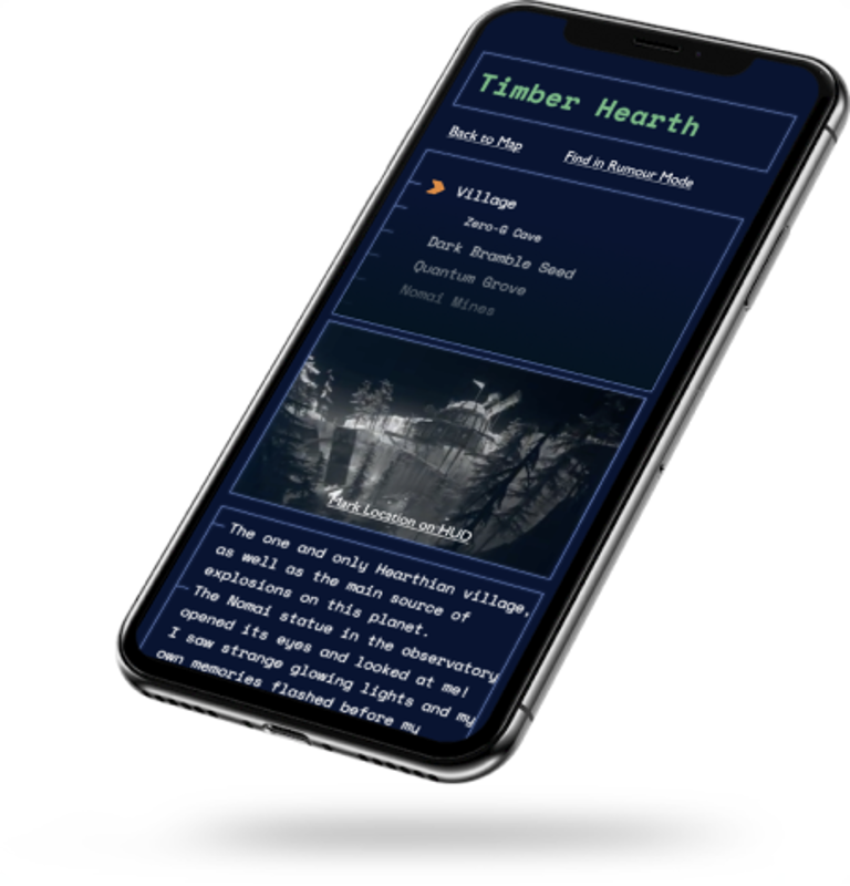 Setting it up would be easy – you’d enter a code into the app, displayed on screen in the game on the Ship Log computer. This unique identifier sets up a sync, which means that from then on, your Ship Log in game and the one on your phone are kept up to date with each other. A seamless experience where uncovering a new location in the game, is immediately reflected on the app (okay, maybe a slight delay while the information gets sent over the internet, but you know what I mean).
